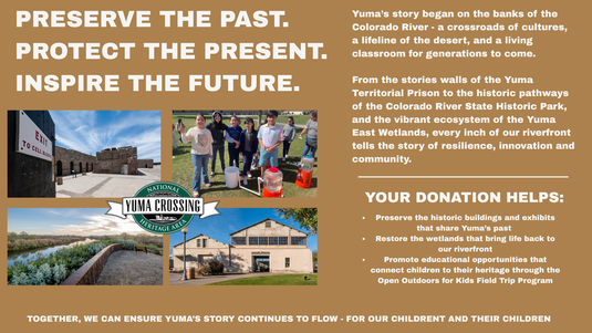 “Preserve the Past. Protect the Present. Inspire the Future.” Yuma’s story began on the banks of the Colorado River — a crossroads of cultures, a lifeline of the desert, and a living classroom for generations to come. From the storied walls of the Yuma Territorial Prison to the historic pathways of the Colorado River State Historic Park, and the vibrant ecosystem of the Yuma East Wetlands, every inch of our riverfront tells the story of resilience, innovation, and community.