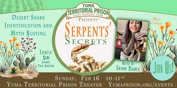 Prepare for an immersive, hands-on encounter at the Yuma Territorial Prison. Learn about snakes found at and around the Prison. You'll gain the expertise to distinguish between native snakes and learn best practices for identifying venomous and non-venomous species. This program is encompassed within the park admission at a fee of just $10 per person, but seats are limited. Cosmos, a rescued native Sonoran gopher snake, will be available for a meet and greet!