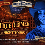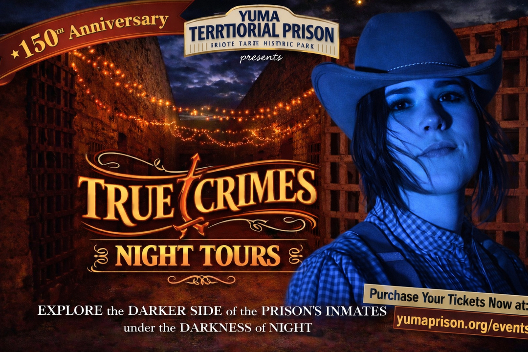 Join us for a TRUE CRIMES NIGHT TOUR through the century-old Yuma Territorial Prison. Storytellers will share tales from the dark side of Yuma’s history as you wander from cell to cell. 3-Nights Only: Thursday, February 12th, Thursday, March 12th, and Saturday, March 28th. From 7pm-8:30pm. Limited tickets available for each evening.